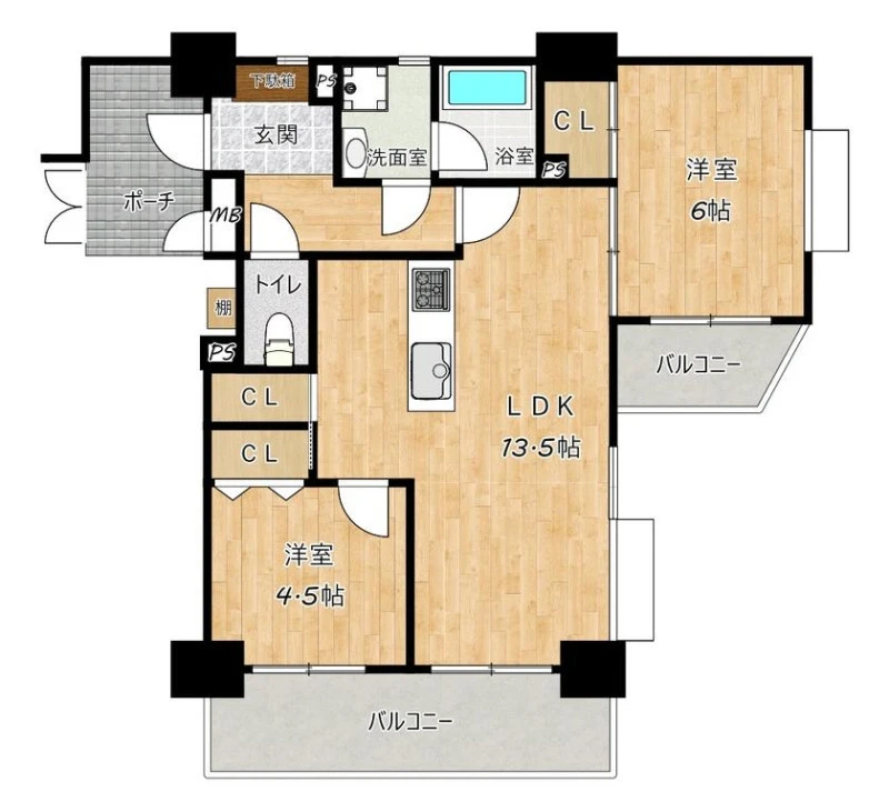 | 間取り | 2LDK | 間取り向き | (角部屋) |