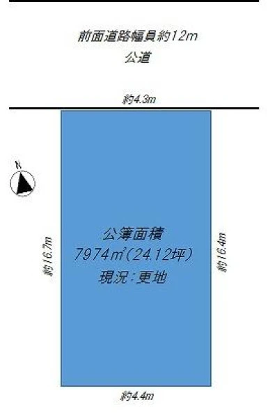 一方 北 間口4.3m 公道 幅12m 位置指定無 |