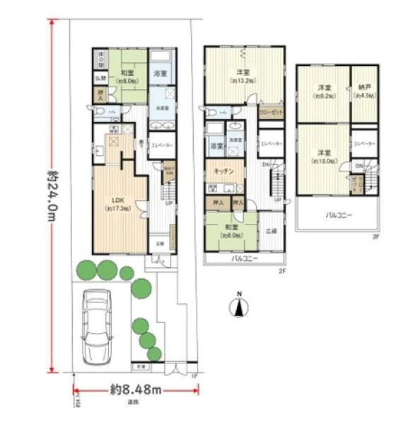 | 設備 | 都市ガス、電気、上水道、下水道、ガスキッチン、システムキッチン、給湯、バス・トイレ別、洗面所、洗面台、室内洗濯機置場、フローリング、庭、収納スペース、エレベータ | ||